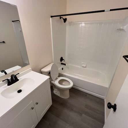 Bathrooms / WC: vanity, sink, faucet with plumbing, bathtub resurfacing, exhaust fan, mirror, shower head, light fixture, accessories.