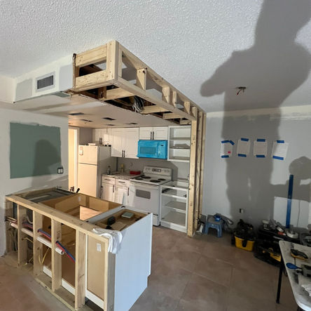 Kitchen: "wall opening" (framing, drywall, electric and plumbing), kitchen cabinets, granit countertop, ceramic backsplash, undermount sink, faucet with plumbing, ceiling spotlights, garbage disposal.